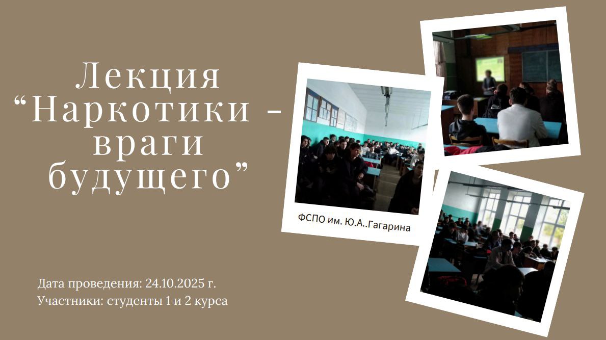 24 октября 2025 года на факультете среднего профессионального образования ФТИ состоялась воспитательная лекция на тему «Наркотики — враги будущего!». В мероприятии приняли участие студенты первого и второго курсов — всего более 90 человек.