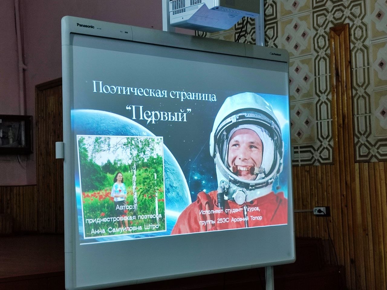 Студенты 1 курса подготовили общее творческое обращение к Ю.А. Гагарину в стихотворной форме. Особое внимание привлекло выступление студента Арсения Топор, который прочитал посвященное Ю.А. Гагарину стихотворение «Первый» приднестровского автора Анны Самуиловны Штро, в свое время окончившей Гагаринский колледж.